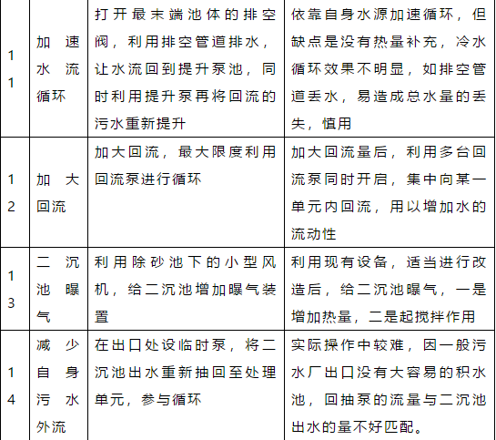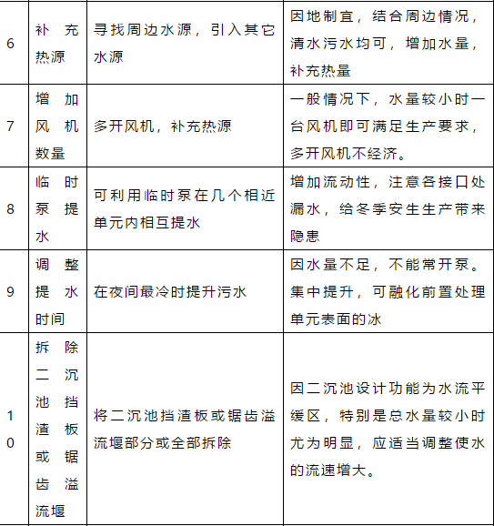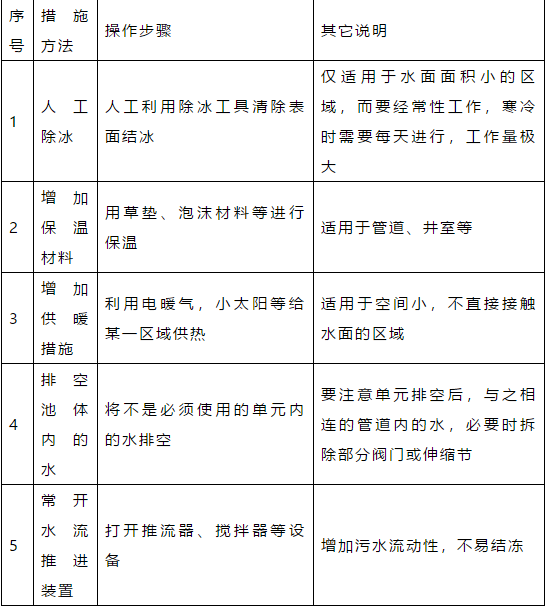 1、環(huán)境溫度降低至零度以下,厭氧、好氧系統(tǒng)的溫度可能會相應(yīng)降低,但對系統(tǒng)的處理能力影響有限。若確實(shí)有影響,對于厭氧系統(tǒng),可以通過提高進(jìn)水水溫的方法來解決(但是,厭氧反應(yīng)器的最高溫度不宜超過38.5℃),對于好氧系統(tǒng),可以通過稍稍提高污泥濃度,或者提高溶解氧的方式解決。
